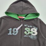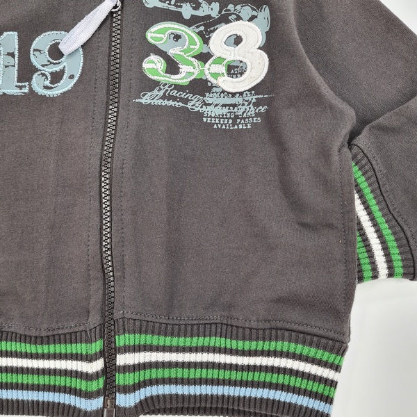 Bluza chłopięca z kapturem w paski, zapinana z przodu na zamek, po bokach dwie kieszenie, długi rękaw, naszywana aplikacja, dół bluzy i rękawy zakończone ściągaczem w paski, dzianina typu cienka dresówka
