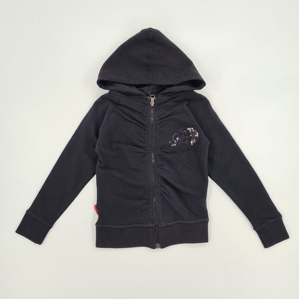 Bluza dziewczęca zapinana na zamek, z kapturem, rękawy oraz dół bluzy wykończone ściągaczem, marszczenie wzdłuż zamka, aplikacja- przyszyte czarne cekiny