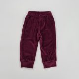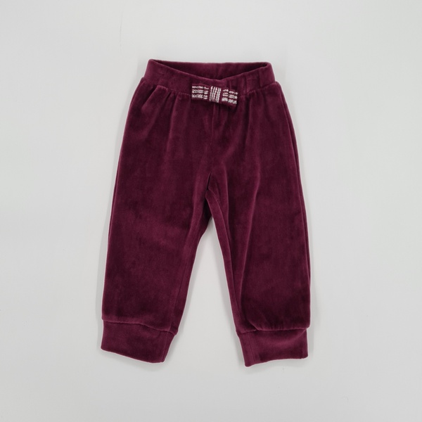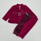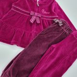 Dres trzyczęściowy w kolorze wiśniowym, bluza zapinana na zamek, dwie falbanki i kokarda nadają eleganckiego charakteru, spodnie z gumą w pasie, spodnie w kolorze bluzy zakończone prostą nogawką, ciemniejsze zakończone ściągaczem