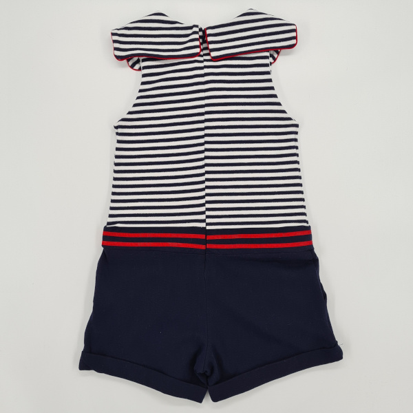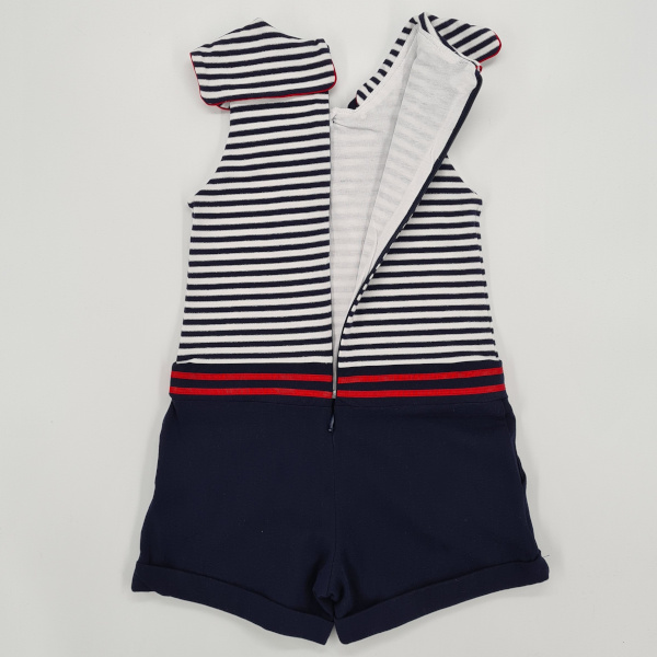 Kombinezon w paski z tzw marynarskim kołnierzem, bez rękawów, zapięcie z tyłu na zamek, z trykotu,paski biało-granatowe przeplatane są srebrną nitką, dwie kieszenie, nierozpinany w kroku, przy szyi ozdobny krawat, w pasie ozdobne guziki