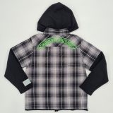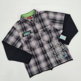 Koszula z klasycznym kołnierzykiem, zapinana na guziki, długi rękaw połączenie materiału koszulowego i trykotu, odpinany kaptur, z przodu dwie kieszonki zapinane na guzik