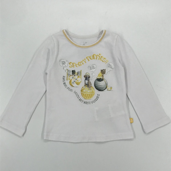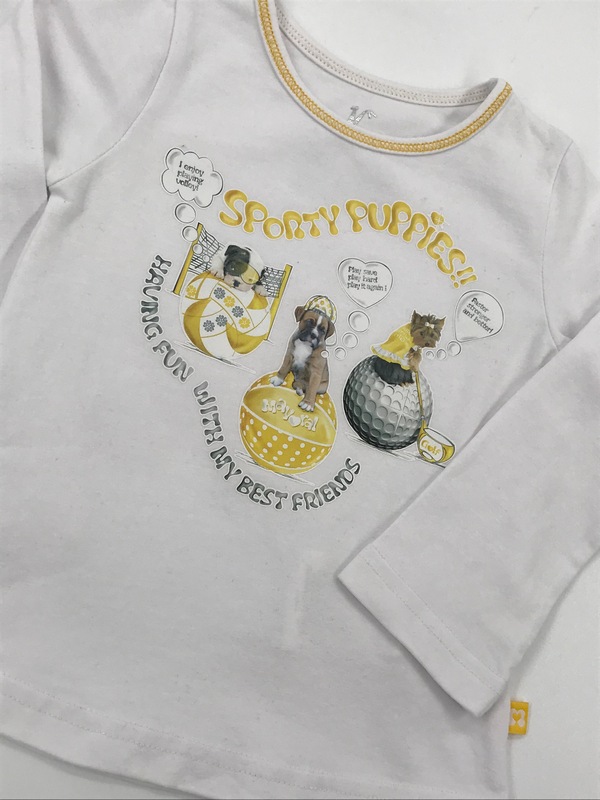 Koszulka w kolorze białym z żółtymi dodatkami, długi rękaw, okrągły dekolt, malowana i gumowana aplikacja