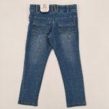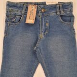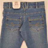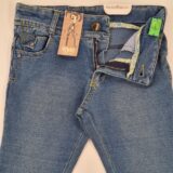 Spodnie z elastycznego, ciągliwego materiału imitującego jeans, długa nogawka, trzy kieszenie z przodu, dwie z tyłu, zapinane na zamek i guzik w pasie, wewnętrzna regulacja pasa