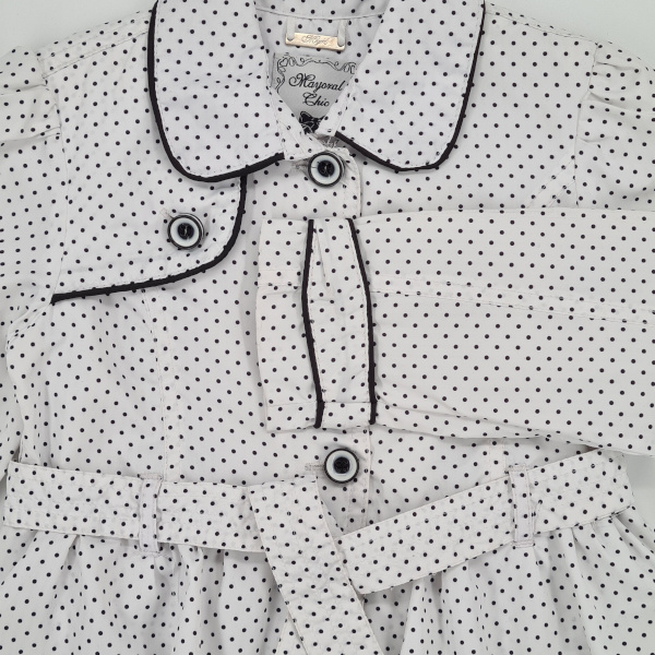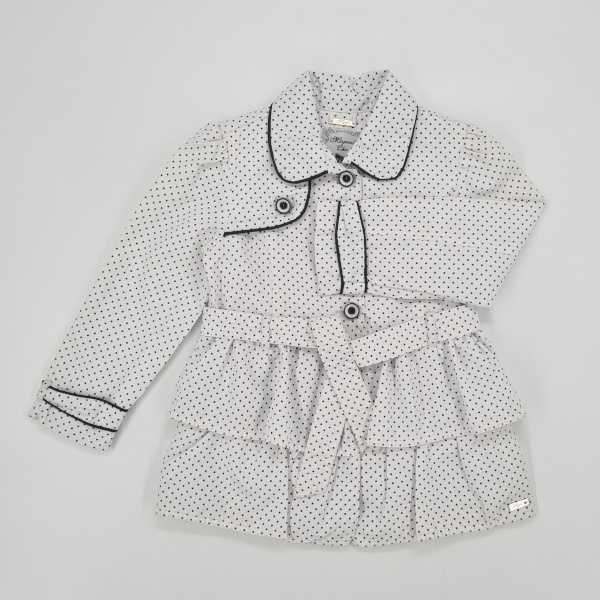 Płaszcz dziewczęcy zapinany na guziki, lekko taliowany, rękawy wykończone ozdobnymi mankietami, wewnątrz podszewka 100% poliester, liczne klapy i falbany nadają eleganckiego charakteru