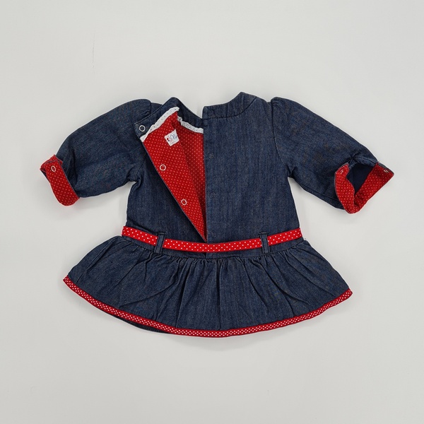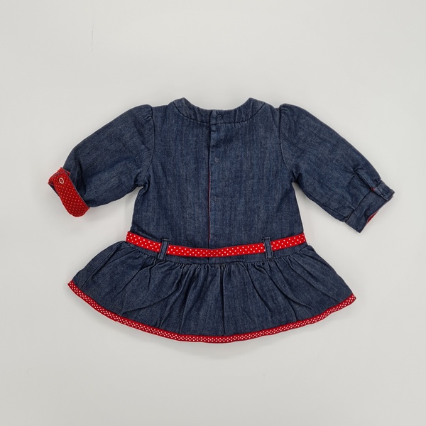 Sukienka-granatowy jeans, okrągły dekolt, długi rękaw zakończony delikatnym mankietem zapinanym na napę, odcięcie z marszczeniem, ozdobny czerwony pasek, tasiemka u dołu oraz guziki w kropki w kontrastowym kolorze, zapinana z tyłu na napy