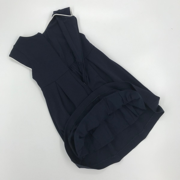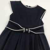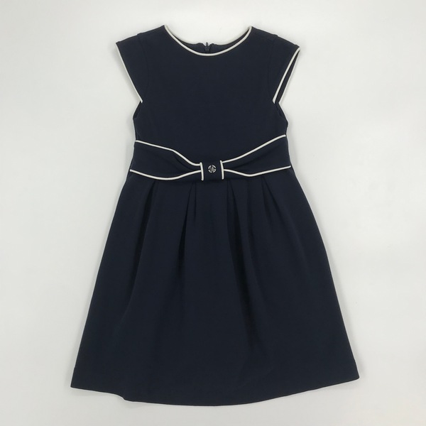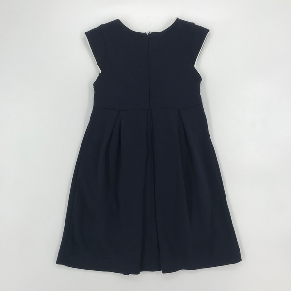 Dzianinowa sukienka w granatowym kolorze, okrągły dekolt, lekko opadający rękawek, zapinana z tyłu na zamek, średniej długości (za kolano), rozkloszowana