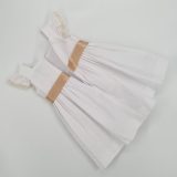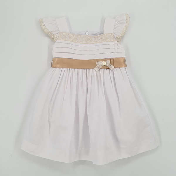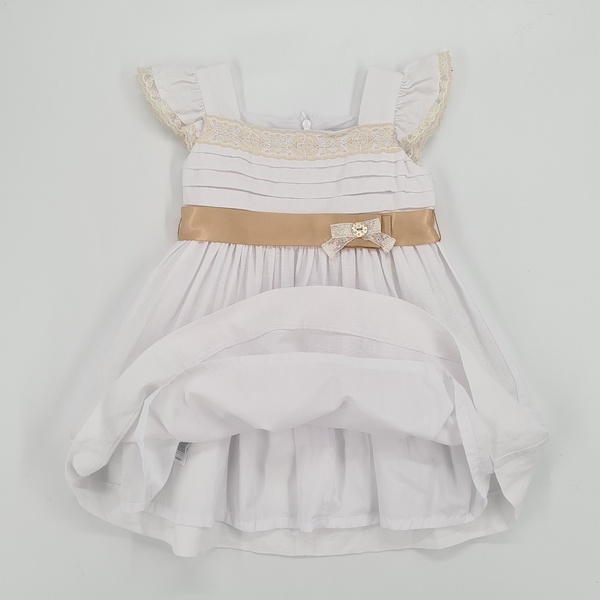 Sukienka biała na ramiączkach z falbankami, z dekoltem typu karo, poniżej ozdobna koronka, liczne zakładki, marszczenie zakryte złotym paskiem z ozdobną kokardą, zapięcie z tyłu na zamek, posiada halkę