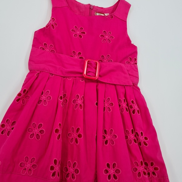 Sukienka z haftowanymi kwiatkami, okrągły dekolt, zapinana z tyłu na zamek, bez rękawków, z halką, z szerokim ozdobnym paskiem z przodu