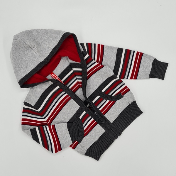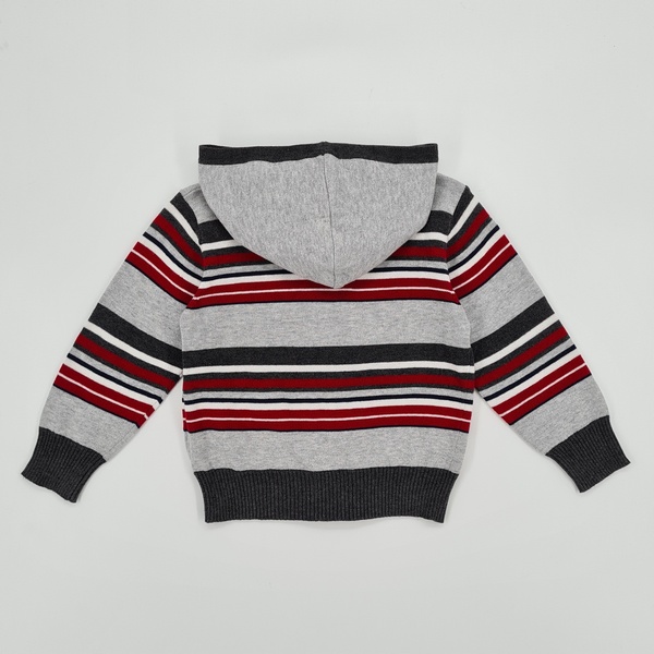 Sweter w paski, z kapturem, długi rękaw, zapinany z przodu na zamek, z przodu dwie kieszenie, rękawy oraz dół swetra wykończone ściągaczem